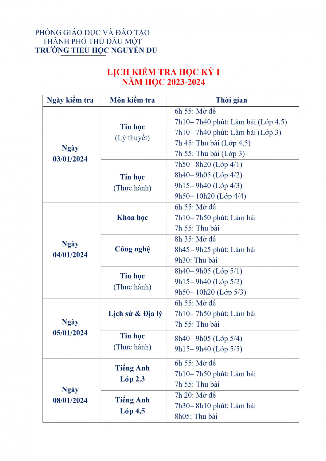 LỊCH KIỂM TRA HỌC KỲ I NĂM HỌC 2023-2024